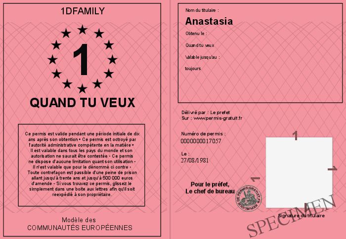 Envoyez par email le Quand tu veux personalisé par la 1DFamily ! Personnaliser mon permis