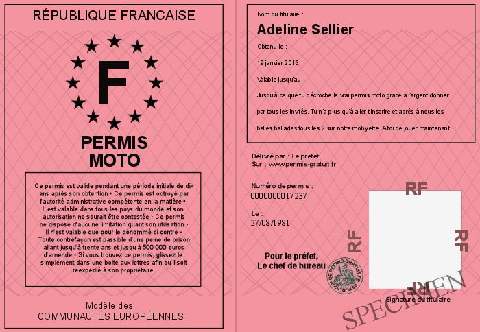 Envoyez par email le Permis moto personalisé par la République Francaise ! Personnaliser mon permis