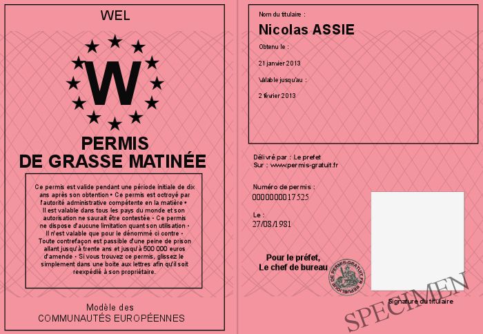 Envoyez par email le Permis de grasse matinée personalisé par la WEL ! Personnaliser mon permis