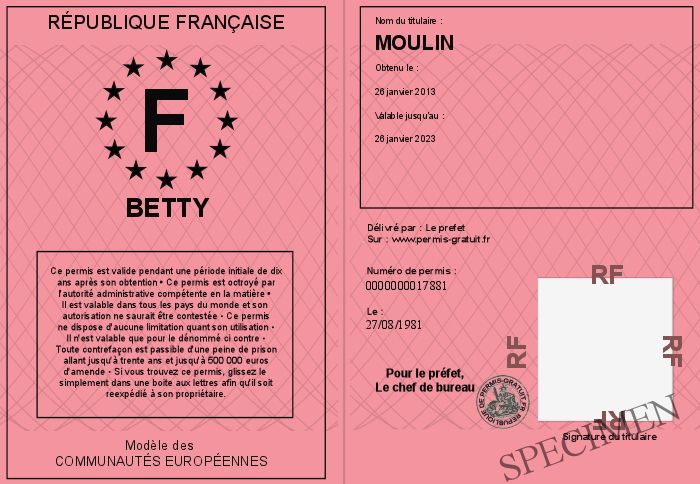 Envoyez par email le Betty personalisé par la République Française ! Personnaliser mon permis