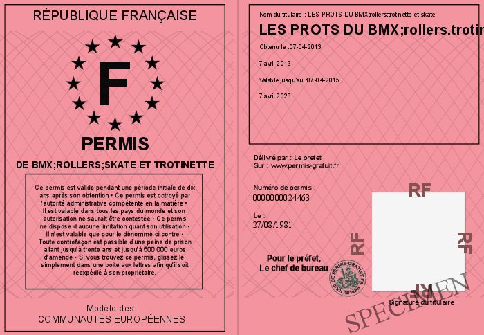 Envoyez par email le Permis de bmx;rollers;skate et trotinette personalisé