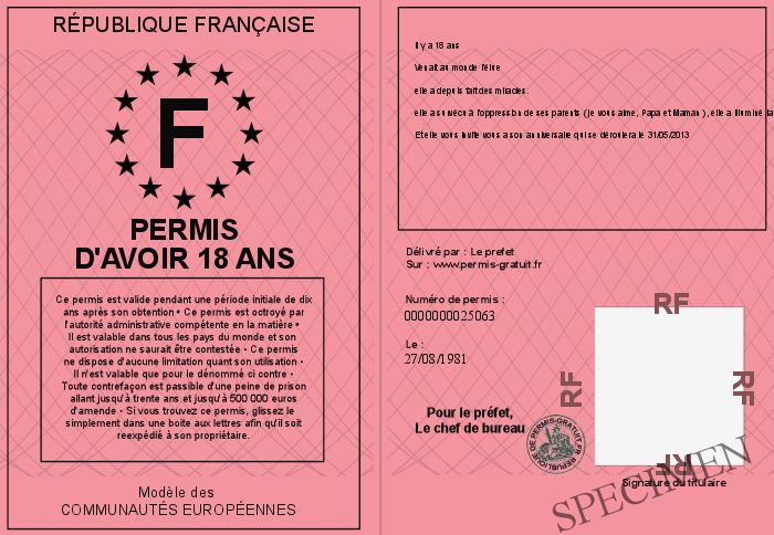 Envoyez par email le Permis d'avoir 18 ans personalisé