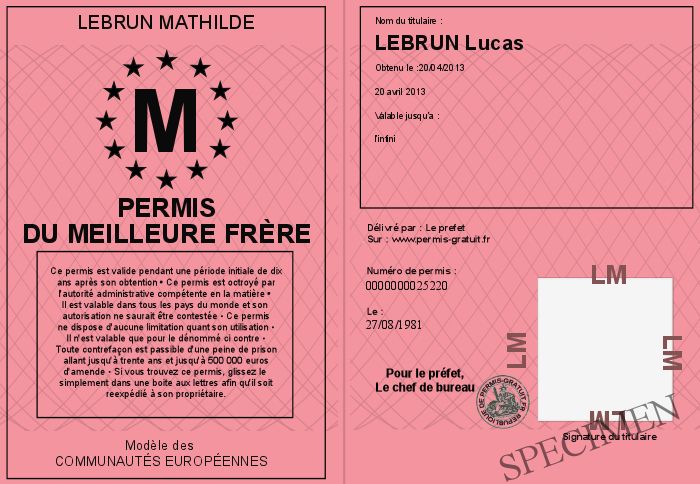 Envoyez par email le PERMIS du meilleure frère personalisé