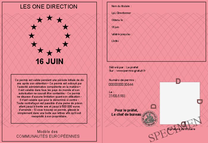 Envoyez par email le 16 juin personalisé par la Les One Direction ! Personnaliser mon permis