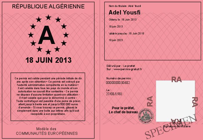 Envoyez par email le 18 Juin 2013 personalisé par la République Algérienne ! Personnaliser mon permis