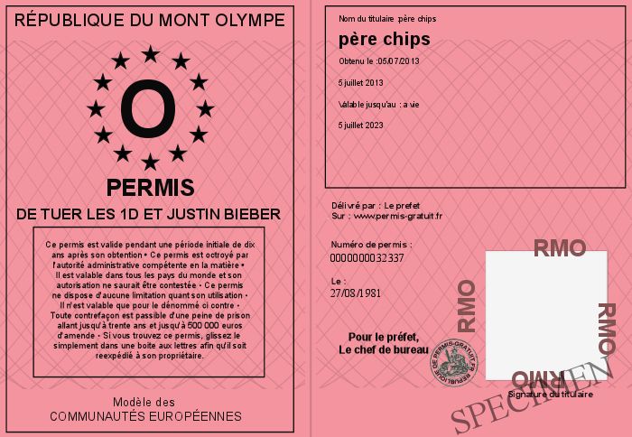 Envoyez par email le Permis de tuer les 1D et justin bieber personalisé
