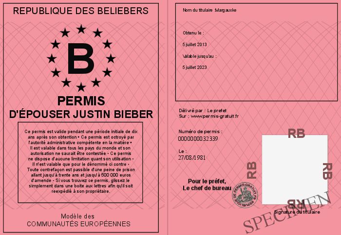 Envoyez par email le Permis D'épouser Justin Bieber personalisé
