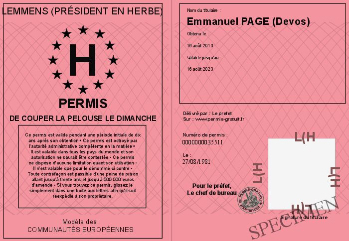 Envoyez par email le Permis de couper la pelouse le dimanche personalisé