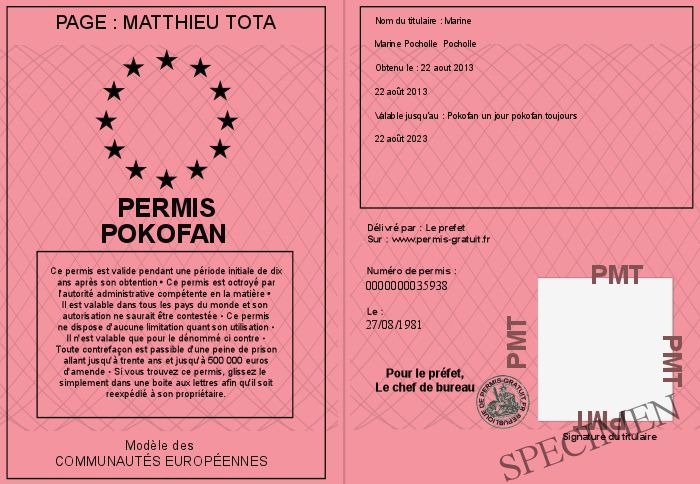Envoyez par email le Permis Pokofan personalisé par la Page : Matthieu Tota ! Personnaliser mon permis