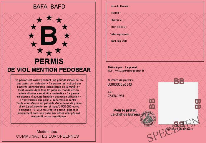 Envoyez par email le Permis de viol mention pedobear personalisé