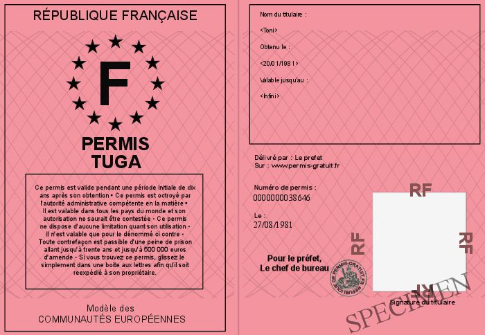 Envoyez par email le Permis TUGA personalisé par la République Française ! Personnaliser mon permis