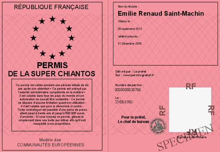 Envoyez par email le Permis de la super chiantos personalisé