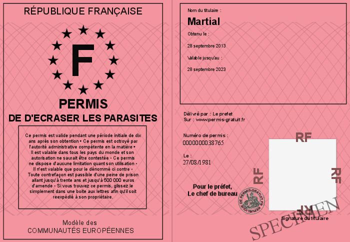 Envoyez par email le Permis de d'ecraser les parasites personalisé
