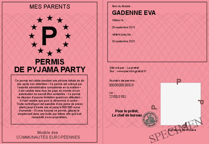 Envoyez par email le Permis de Pyjama Party personalisé par la Mes Parents ! Personnaliser mon permis