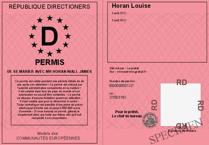 Envoyez par email le Permis de se marier avec Mr Horan Niall James personalisé