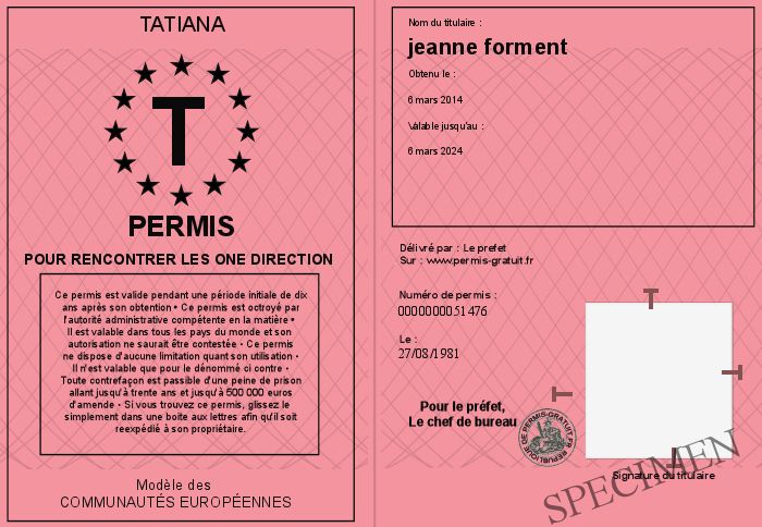 Envoyez par email le Permis pour rencontrer les one direction personalisé