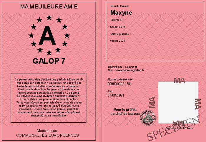 Envoyez par email le Galop 7 personalisé par la Ma Meuileure Amie ! Personnaliser mon permis