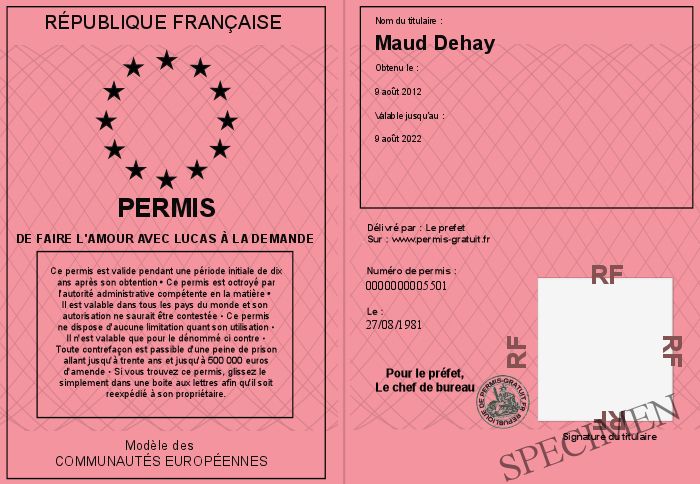 Envoyez par email le Permis de faire l'amour avec Lucas à la demande personalisé