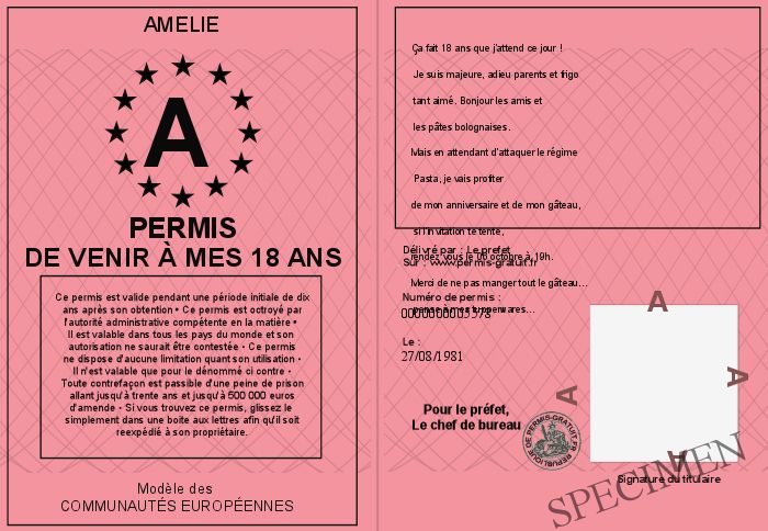 Envoyez par email le Permis de venir à mes 18 ans personalisé par la AMELIE ! Personnaliser mon permis
