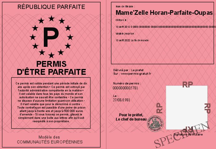 Envoyez par email le Permis d'être parfaite personalisé