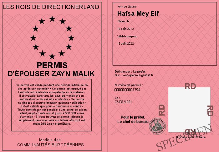 Envoyez par email le Permis D'épouser Zayn Malik personalisé
