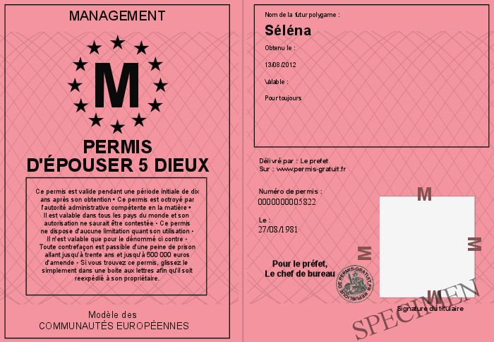 Envoyez par email le Permis d'épouser 5 dieux personalisé par la Management ! Personnaliser mon permis