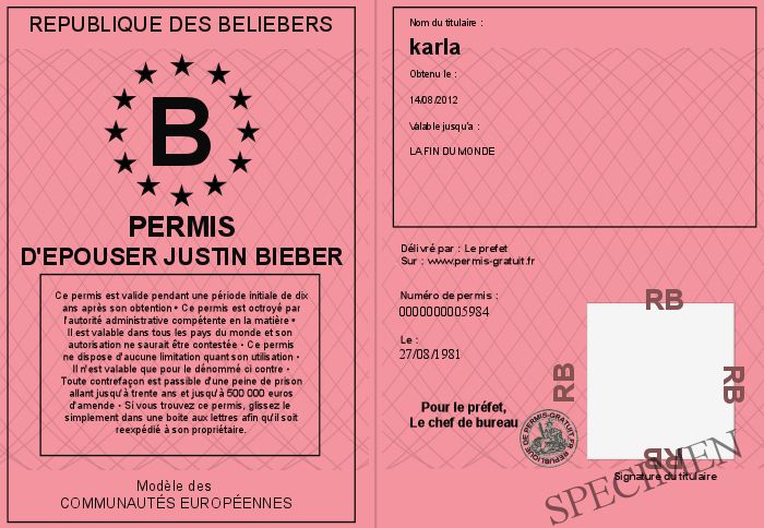 Envoyez par email le Permis d'epouser justin bieber personalisé