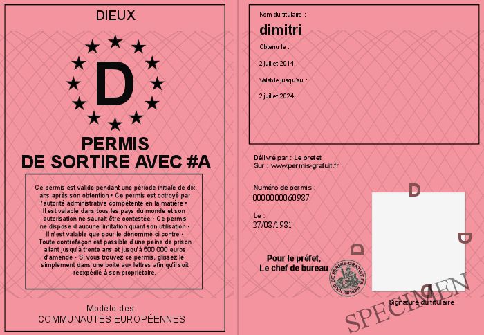 Envoyez par email le Permis de sortire avec #a personalisé par la dieux ! Personnaliser mon permis
