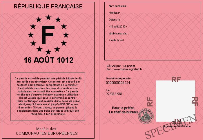 Envoyez par email le 16 août 1012 personalisé par la République Française ! Personnaliser mon permis