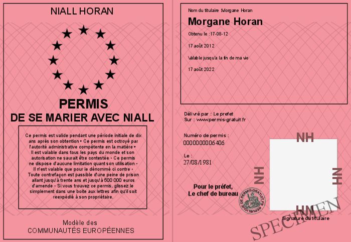 Envoyez par email le Permis de se marier avec Niall personalisé
