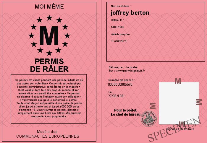 Envoyez par email le Permis de râler personalisé par la moi même ! Personnaliser mon permis