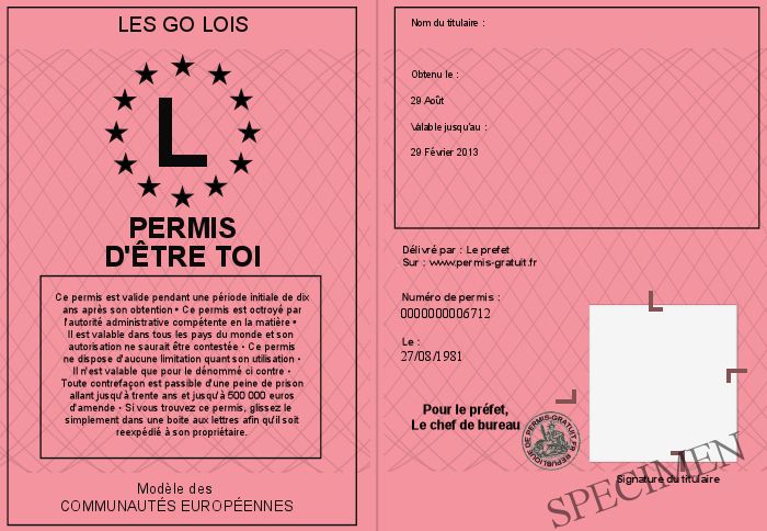 Envoyez par email le Permis d'être toi personalisé par la Les GO lois ! Personnaliser mon permis