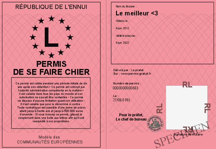 Envoyez par email le Permis de se faire chier personalisé