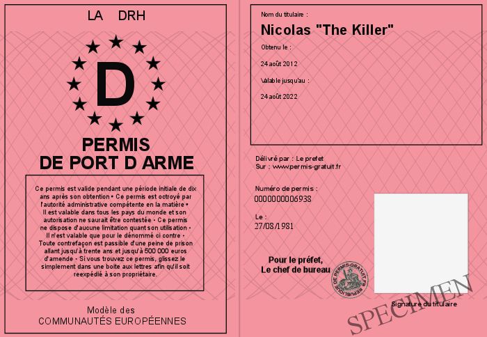 Envoyez par email le Permis de port d arme personalisé par la La DRH ! Personnaliser mon permis