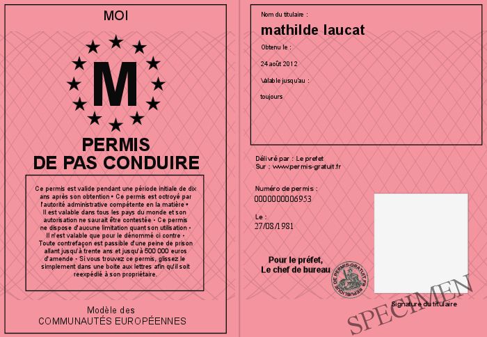 Envoyez par email le Permis de pas conduire personalisé par la moi ! Personnaliser mon permis
