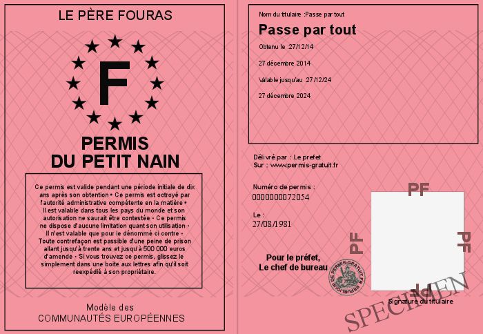 Envoyez par email le Permis du petit nain personalisé par la le père fouras ! Personnaliser mon permis