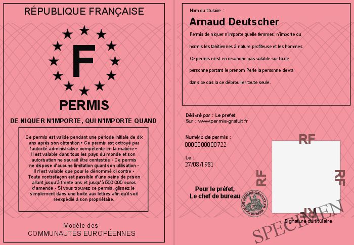 Envoyez par email le Permis de niquer n'importe, qui n'importe quand personalisé