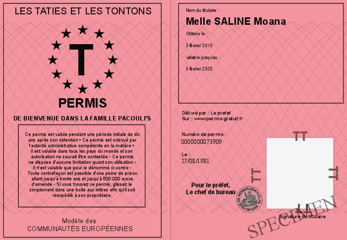 Envoyez par email le permis de bienvenue dans la famille pacouli's personalisé