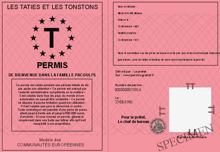 Envoyez par email le Permis de BIENVENUE DANS LA FAMILLE PACOULI'S personalisé