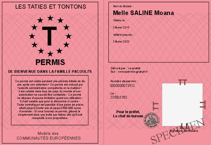 Envoyez par email le Permis de BIENVENUE DANS LA FAMILLE PACOULI'S personalisé