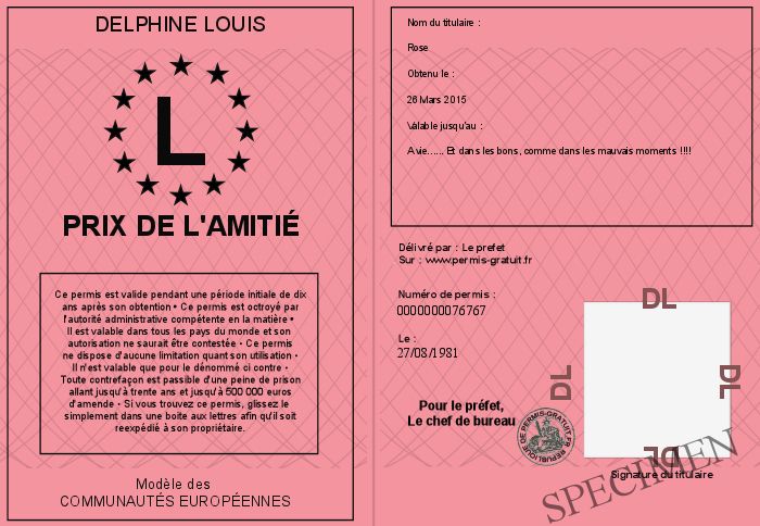Envoyez par email le Prix de l'Amitié personalisé par la Delphine Louis ! Personnaliser mon permis