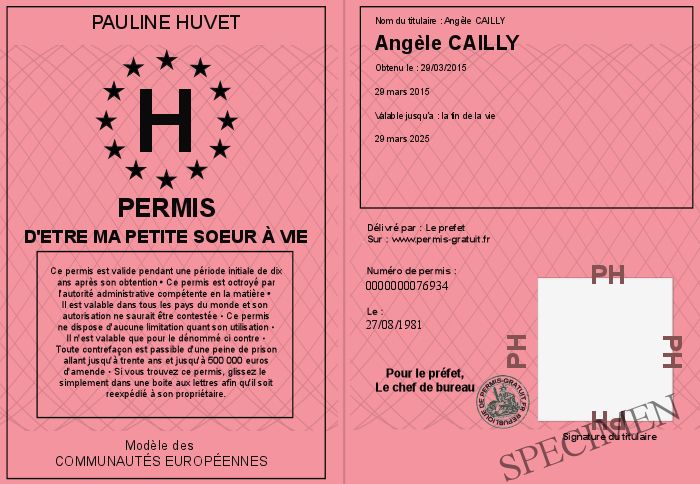 Envoyez par email le Permis d'etre ma petite soeur à vie personalisé