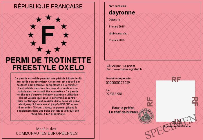 Envoyez par email le permi de trotinette freestyle oxelo personalisé