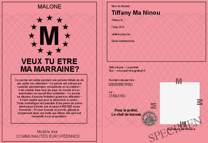 Envoyez par email le Veux tu etre ma Marraine? personalisé par la Malone ! Personnaliser mon permis