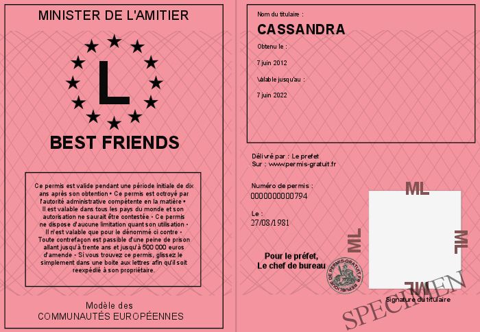 Envoyez par email le BEST FRIENDS personalisé par la MINISTER DE L'AMITIER ! Personnaliser mon permis