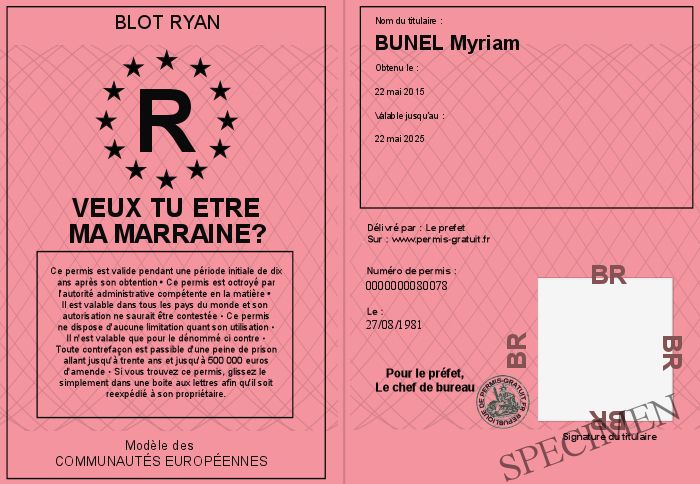 Envoyez par email le Veux tu etre ma marraine? personalisé par la BLOT Ryan ! Personnaliser mon permis