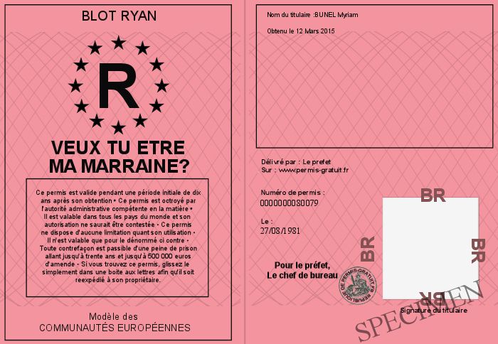 Envoyez par email le Veux tu etre ma marraine? personalisé par la Blot Ryan ! Personnaliser mon permis