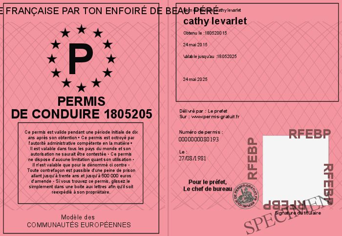 Envoyez par email le Permis de conduire 1805205 personalisé