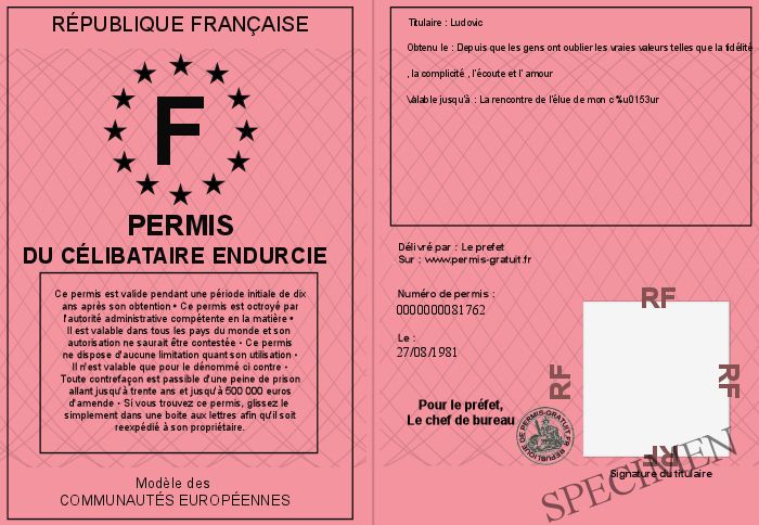 Envoyez par email le Permis du célibataire endurcie personalisé