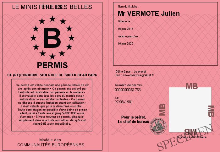 Envoyez par email le Permis de (re)conduire son rôle de Super Beau Papa personalisé